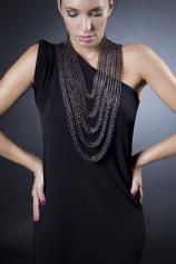 Colierul handmade este realizat prin impletirea zalelor negre in cinci siruri, care se alungesc delicat pe silueta. Ceea ce este fascinant la aceasta piesa este simplitatea ei si cum aceasta simplitate poate infrumuseta si completa o tinuta. Colierul Bristena se poate realiza si din zale argintii.