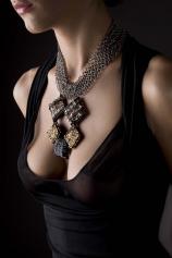 Colierul este realizat prin impletirea manuala a zalelor de culoare negru metalizat, inspirata din ochiurile impletiturilor tricotate manual. Pandantivul compus din cinci patrate din saten, pe care s-a cusut manual margele negre si aurii, accentueaza decolteurile feminine.